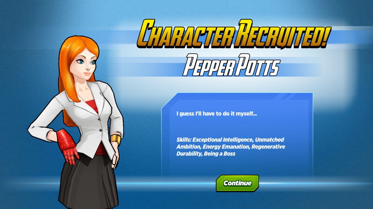 Hey hey, just a bit of info here regarding what happened when you were able to recruit Pepper Potts in the Rescue event! So if you weren't able to get her, I'll be recording the dialogue here for you to read!